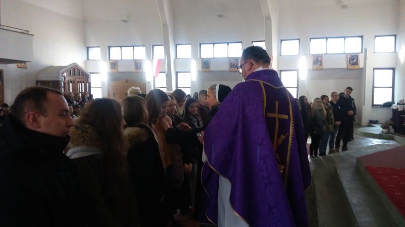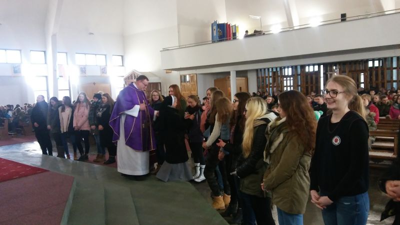 Po sesjach, w szkole wzięła udział w Eucharystii, razem z uczniami i nauczycielami, w kościele parafialnym. Podczas tej Mszy świętej miała przyjemność wręczenia młodzieży, która podjęła się duchowej adopcji dziecka poczętego, tarczy ze stópkami 11-tygodniowego nienarodzonego dziecka w skali 1:1.