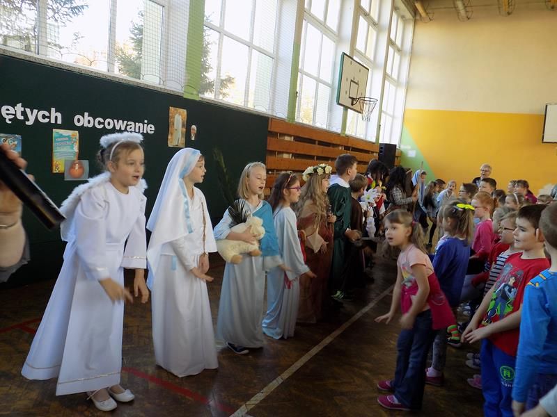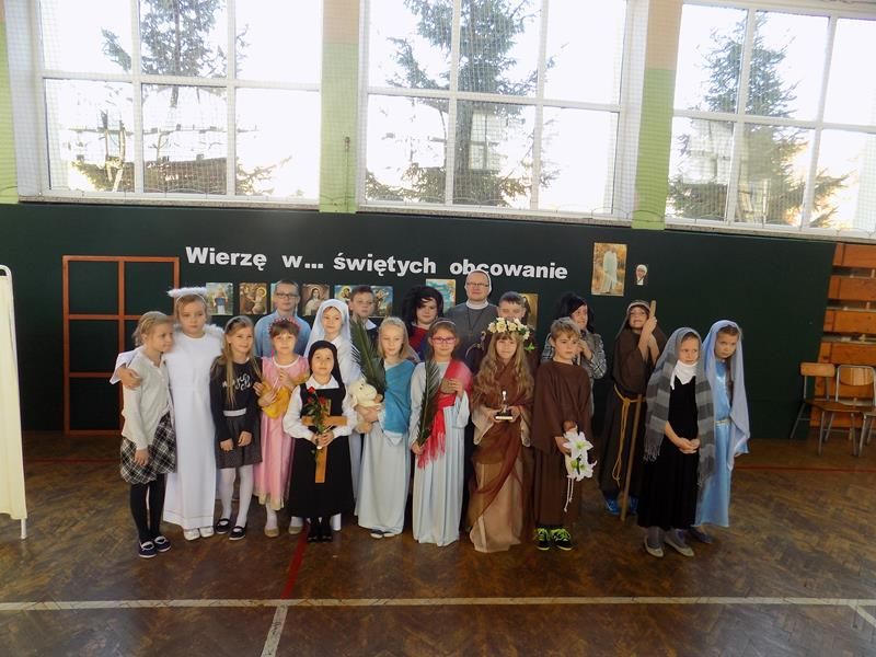 Przygotowując się do Uroczystości Wszystkich Świętych uczniowie klas 0-III Szkoły podstawowej nr 9 w Siedlcach spotkali się na apelu. Podczas wspólnego spotkania odkrywaliśmy prawdę o naszym powołaniu do świętości, mogliśmy zobaczyć małych aktorów, którzy wcielili się w Świętych: Maryję, św. Józefa, św. Jana Chrzciciela, św. Krzysztofa, św. Antoniego, Św. Annę, św. Agnieszkę, św. Agatę, św. Marię Magdalenę, św. Tereskę od Dzieciątka Jezus,św. Teresę z Kalkuty, św. Cecylię, św. Piotra i św. Franciszka. Dzieci grający role Świętych zadawali zagadki o tym kim są i kogo przedstawiają, a rówieśnicy odgadywali imiona Świętych. Nasz apel uświetnił swoją obecnością pan Wojtek, który swoim graniem zachęcał nas do wspólnego i radosnego śpiewania. Na koniec dzieci otrzymały pamiątkowe obrazki.