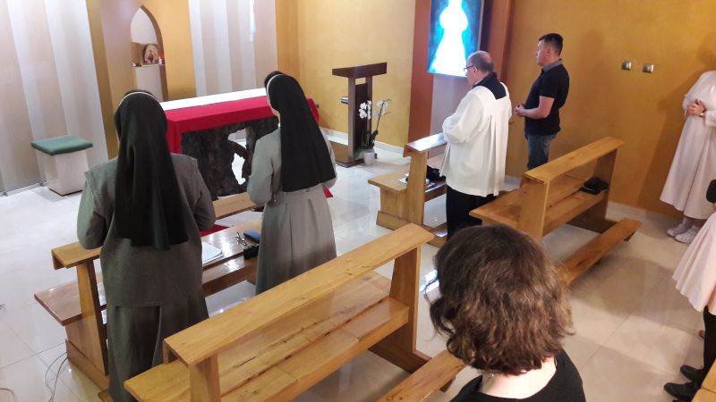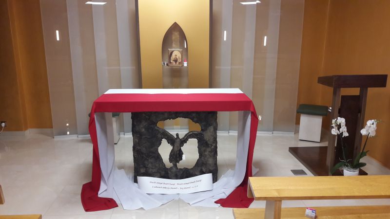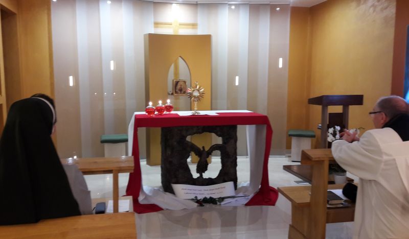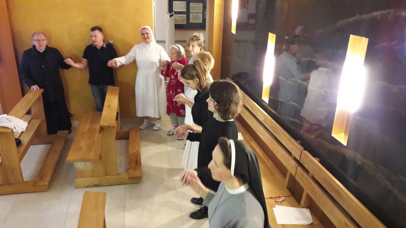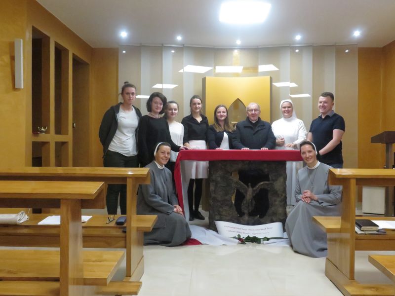 Przyozdobiony ołtarz barwami biało czerwonymi przypominał nam o geście miłości ojca Założyciela wobec Polaków i Ojczyzny. W tym samym geście każdy z uczestników spotkania ze wzruszeniem złożył swój pocałunek wdzięczności.